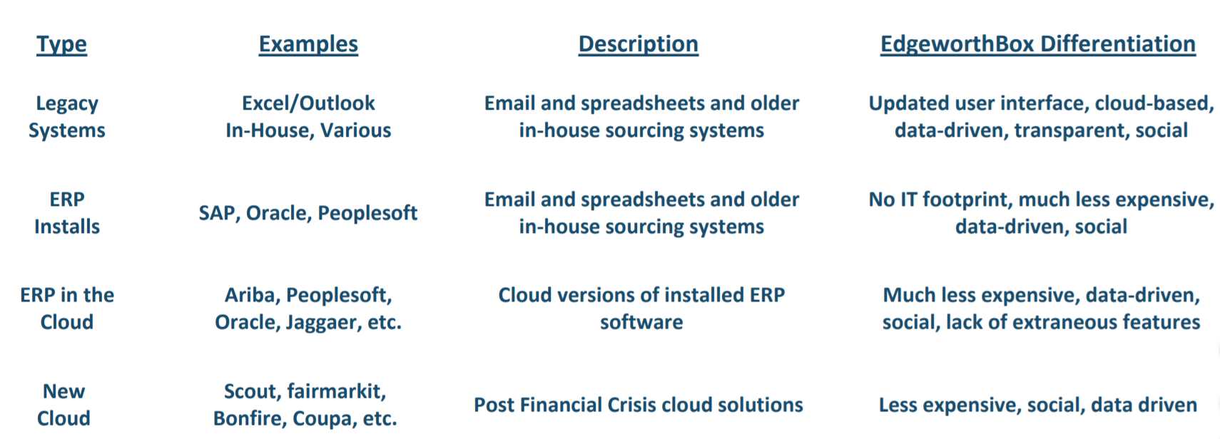 At the most elemental level, EdgeworthBox is the only solution in the marketplace that is designed to change the underlying business process of the RFP to make it into a workable reverse auction.