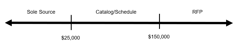 There is a spectrum of procurement with three sections defined by the size of the purchase. The thresholds in the diagram below vary from organization to organization. These are samples.